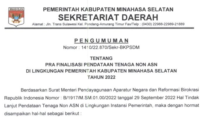 Pengumuman Pra Finalisasi Pendataan Tenaga Non ASN di lingkungan Pemerintah Kabupaten Minahasa Selatan Tahun 2022