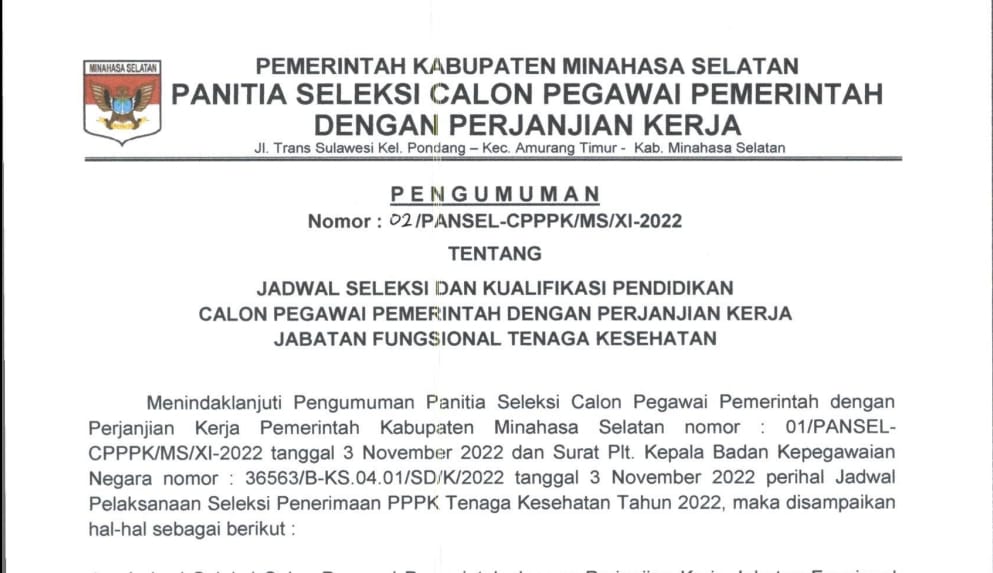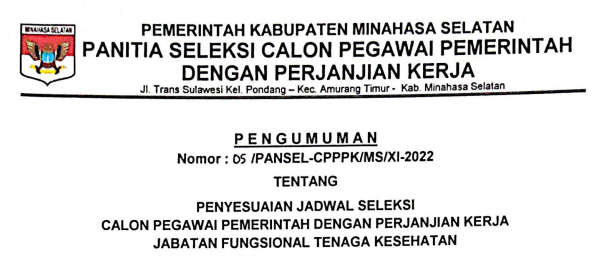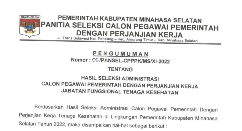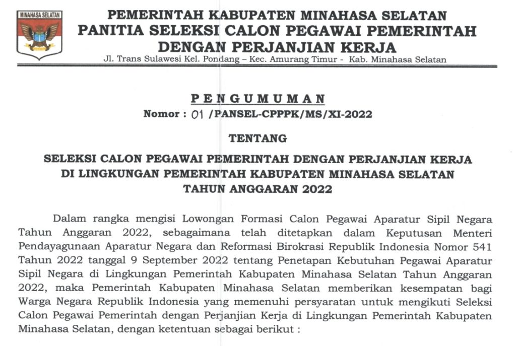 SELEKSI CALON PEGAWAI PEMERINTAH DENGAN PERJANJIAN KERJA DI LINGKUNGAN PEMERINTAH KABUPATEN MINAHASA SELATAN TAHUN ANGGARAN 2022