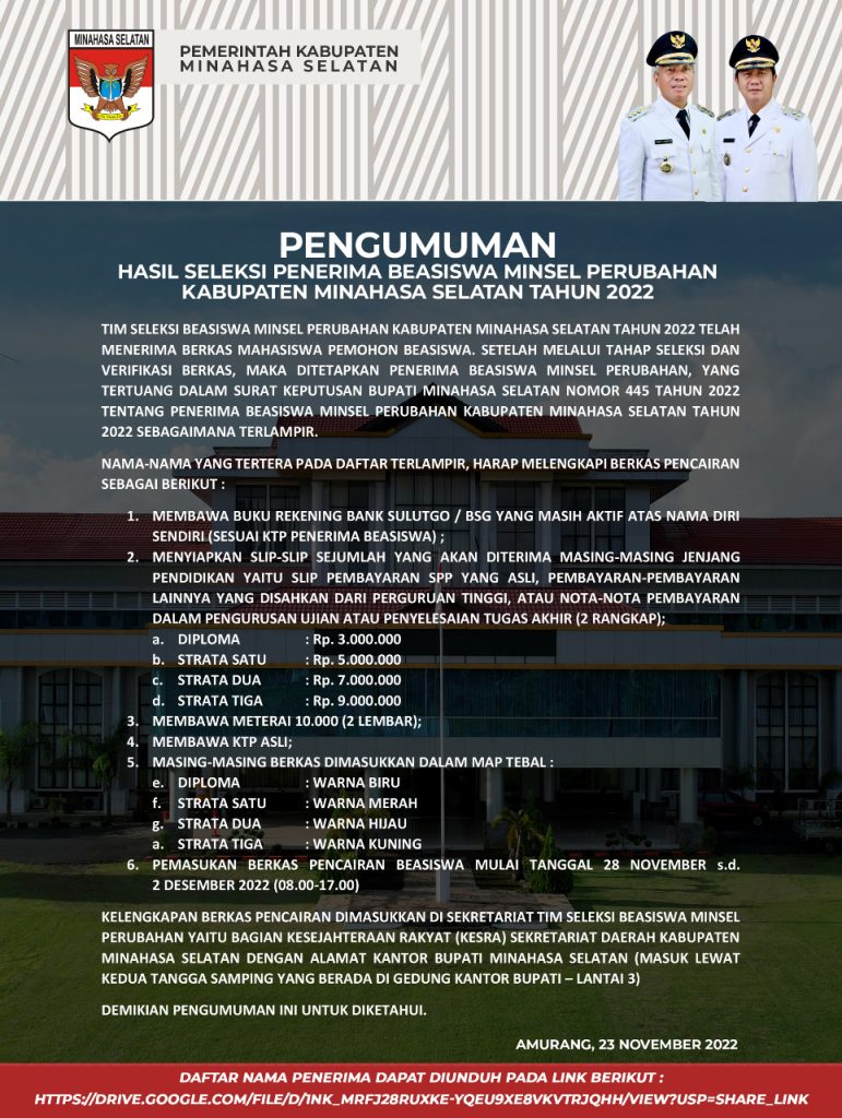 Pengumuman Hasil Seleksi Penerima Beasiswa “Minsel...