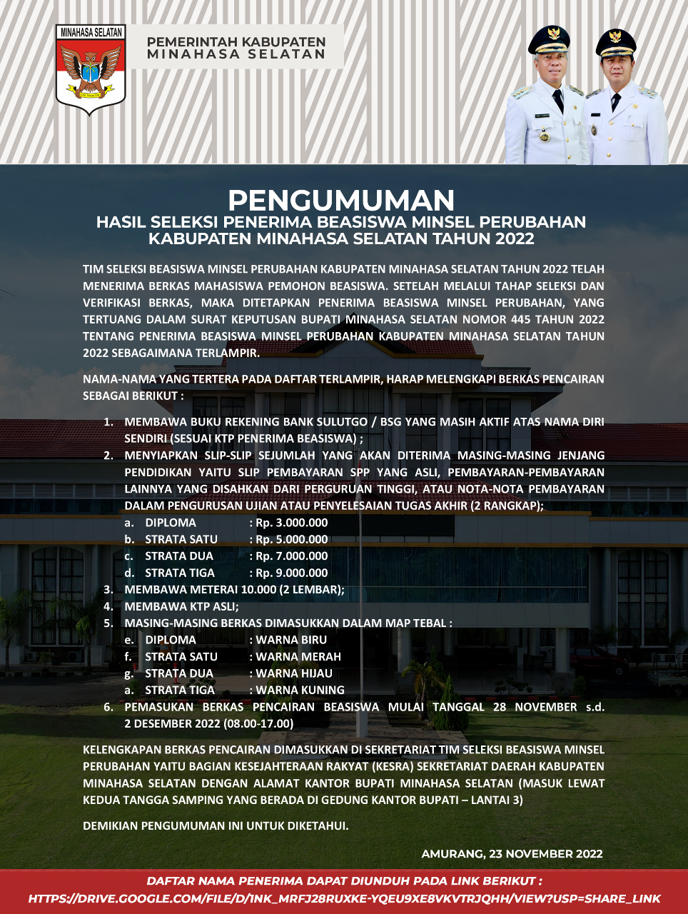 Pengumuman Hasil Seleksi Penerima Beasiswa “Minsel Perubahan” Kabupaten Minahasa Selatan Tahun 2022. Setelah melakukan Tahap Seleksi dan Verifikasi berkas, maka ditetapkan Penerima Beasiswa sebagaimana tertuang dalam Surat Keputusan Bupati Minahasa Selatan Nomor 445 Tahun 2022.