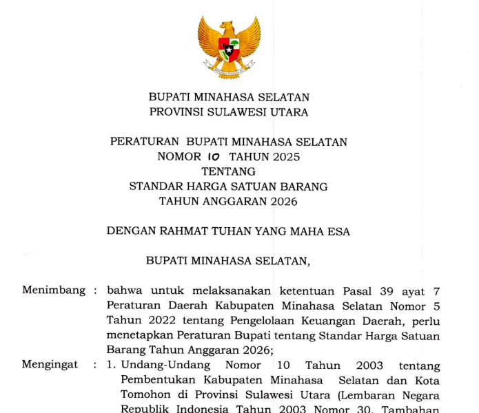 - PERATURAN BUPATI MINAHASA SELATAN NOMOR 10 TAHUN 2025 TENTANG STANDAR HARGA SATUAN BARANG TAHUN ANGGARAN 2026