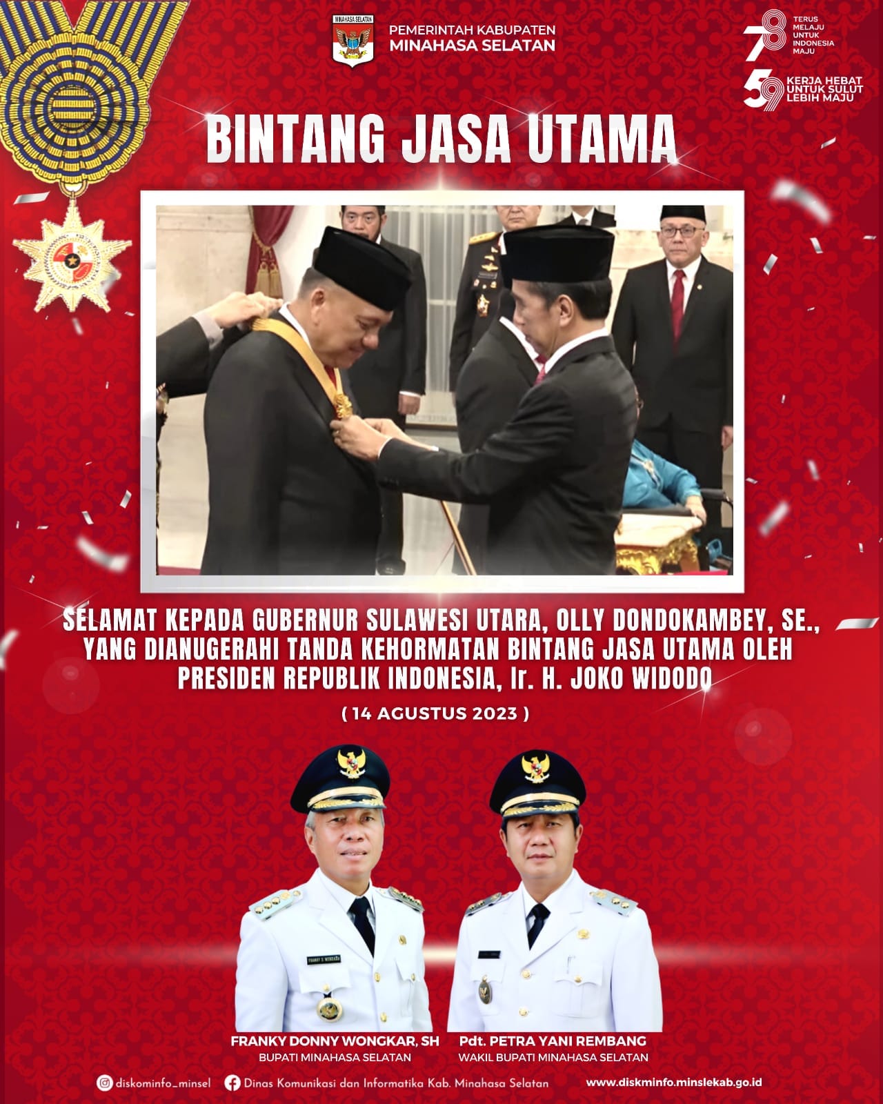 UCAPAN SELAMAT ATAS PENGANUGERAHAN TANDA KEHORMATAN BINTANG JASA UTAMA OLEH PRESIDEN REPUBLIK INDONESIA IR. H. JOKO WIDODO KEPADA GUBERNUR SULAWESI UTARA OLLY DONDOKAMBEY, SE. ATAS JASA-JASA DAN PENGABDIAN KEPADA BANGSA DAN NEGARA.