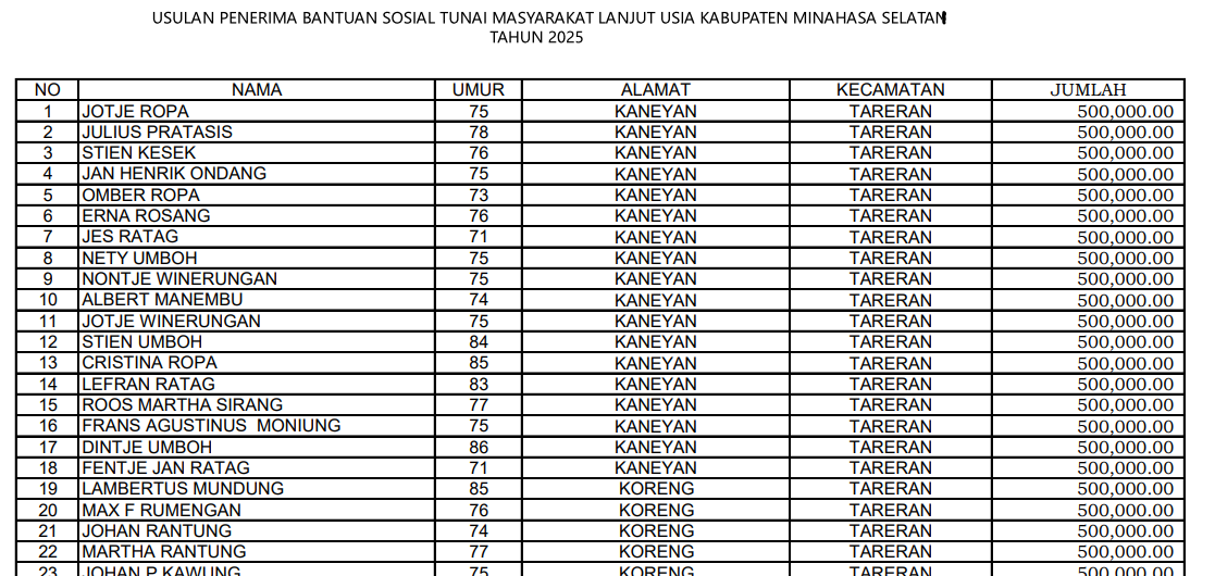 Usulan Penerima Bantuan Sosial Tunai Masyarakat Lanjut Usia Kabupaten Minahasa Selatan Tahun 2025